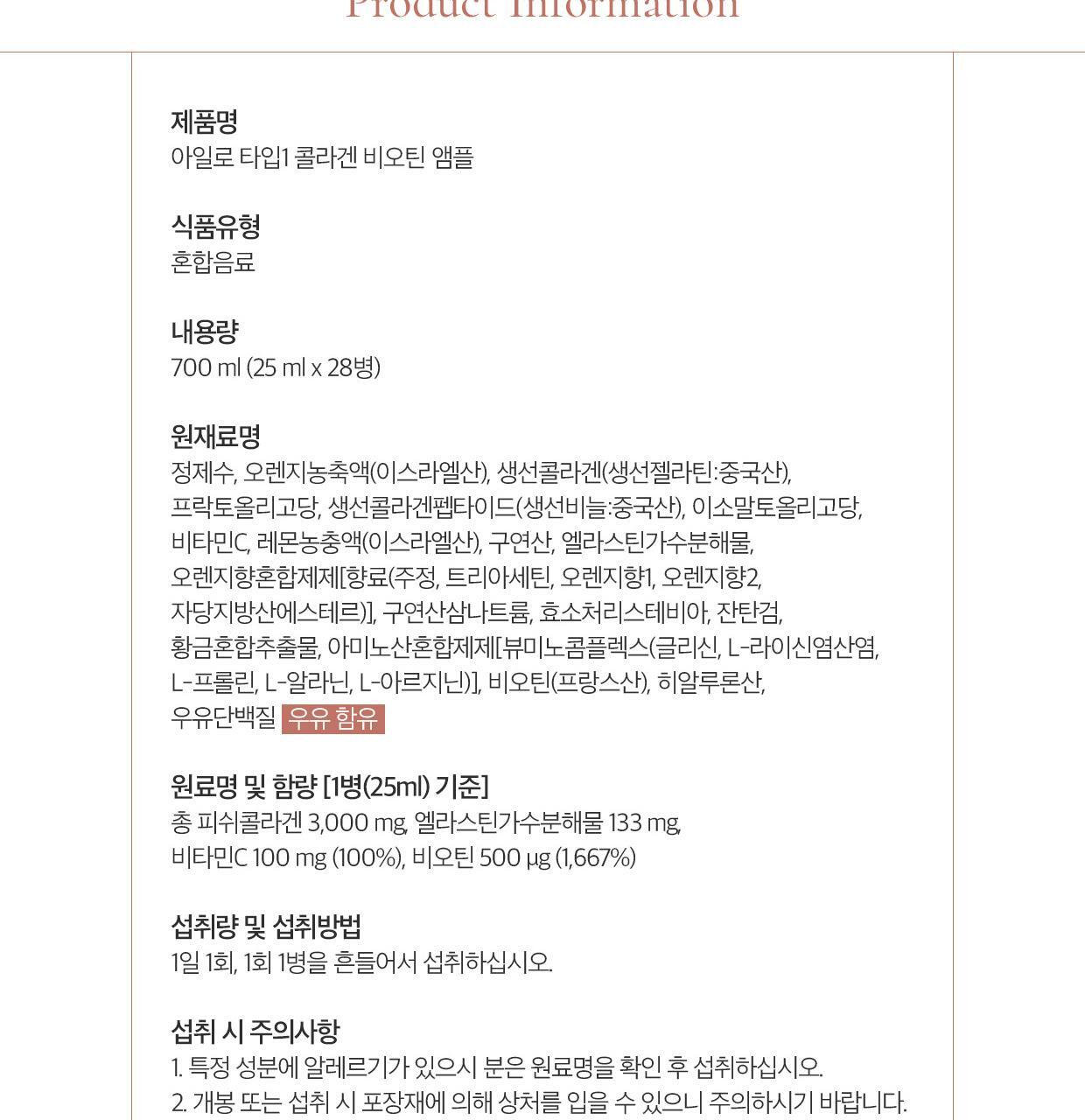 【Irene 精選】韓國 AILO Type1 膠原蛋白+生物素安瓶 28支(28天份) 產品簡介 AILO Type1 膠原蛋白+生物素安瓶由韓國東亞藥廠研發,專為肌膚彈性、光澤與健康髮膚指甲而設計。以高純度 Type1 膠原蛋白為核心,搭配生物素與多種維生素,幫助由內而外補充營養,支持美肌、強韌髮質與整體健康。每盒 28 支安瓶,提供完整 28 天份量,適合日常保養。 產品特色 1. 高純度 Type1 膠原蛋白 Type1 是人體肌膚與結締組織最主要的膠原蛋白種類 小分子好吸收,從體內補充彈性來源 支持肌膚緊緻、彈潤與光澤 2. 生物素加乘作用 生物素有助維持頭髮、皮膚與指甲健康 搭配膠原蛋白,全面支持美麗基礎 幫助改善脆弱髮質與指甲斷裂問題 3. 多重維生素協同配方 維生素 C:促進膠原蛋白合成 維生素 E:抗氧化、保護細胞 維持肌膚穩定度,提升整體氣色 4. 安瓶式設計,方便飲用 每日一瓶,簡單補充關鍵營養 液態安瓶保持新鮮與活性 小容量設計,隨身攜帶方便 5. 專業製藥品質 由韓國東亞藥廠依照 GMP 規格生產 成分安全、品質穩定 適合長期保健與日常飲用 建議飲用方式 每日 1 瓶,餐前或餐後皆可 可直接飲用,也可加入飲品中 建議持續飲用 4–8 週,效果更顯著 適用族群 想提升肌膚彈性、光澤的人士 想改善髮質、指甲健康的上班族與學生 熬夜、壓力大、膚況不穩定者 注重美麗與健康維持的輕熟齡族群 飲用後可期待的效果 肌膚更緊緻、彈潤 髮質更強韌、指甲更健康 氣色更明亮、透亮 整體精神與狀態更穩定 |